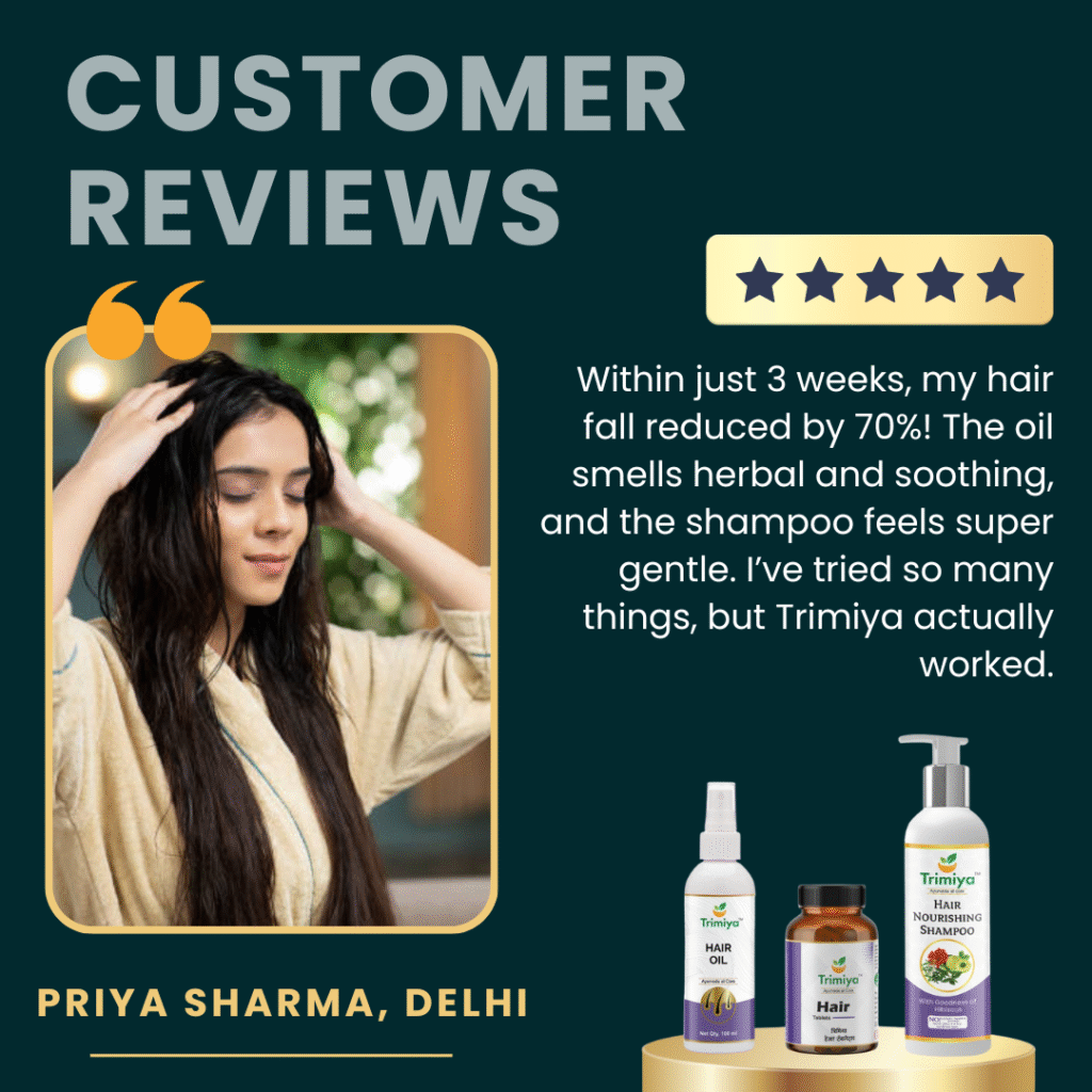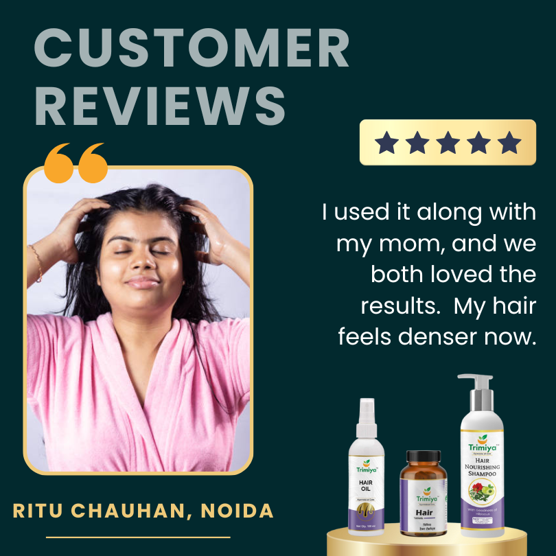 Starting your hair growth journey with Trimiya is simple and effective. Just follow three easy steps. First, gently massage Trimiya Hair Oil into your scalp 2–3 times a week to nourish the roots and improve blood circulation. Then, wash your hair with the Trimiya Nourishing Shampoo, made with natural herbs that clean without stripping away essential oils. Finally, take Trimiya Hair Tablets twice daily—after breakfast and dinner—to support internal nourishment and strengthen your hair from within.
