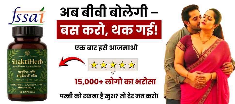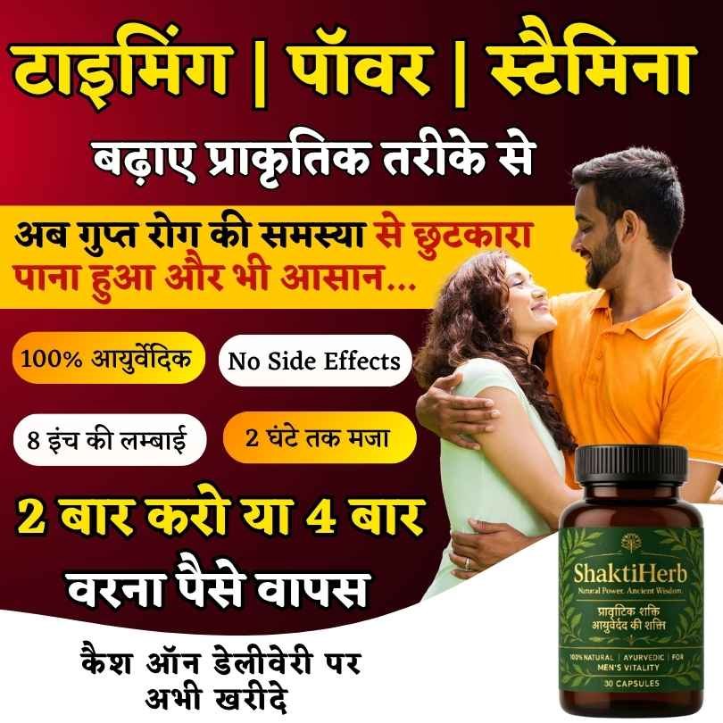 हमारे भारत में अश्वगंधा, शिलाजीत, सफ़ेद मूसली, गोखुरा, केसर, शतावरी, मकरध्वज, जैसी शक्तिशाली जड़ीबूटियां मौजूद है जो किसी भी तरह के गुप्त रोगों को जड़ से उखाड़ फेकती है। इसीलिए 13 जड़ीबूटियों और भस्मों को उचित मात्रा में मिश्रण करके बनाया गया है आयुर्वेदिक “Shakti Herb“ जी हाँ Ayurveda द्वारा बनाई गयी ये दवा सिर्फ शीघ्रपतन ही नहीं बल्कि सभी प्रकार के गुप्त रोगों में बहुत असरदार है और पूर्ण रूप से सुरक्षित भी है। वही, केमिकल वाली गोलियां गुप्त रोगों पर कोई असर नहीं करती बल्कि कार्डियक अरेस्ट, लिवर डैमेज, हार्ट स्ट्रोक, और प्रोस्टेट रिलेटेड समस्या उत्पन्न कर सकती है।