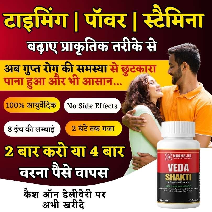 हमारे भारत में अश्वगंधा, शिलाजीत, सफ़ेद मूसली, गोखुरा, केसर, शतावरी, मकरध्वज, जैसी शक्तिशाली जड़ीबूटियां मौजूद है जो किसी भी तरह के गुप्त रोगों को जड़ से उखाड़ फेकती है। इसीलिए 13 जड़ीबूटियों और भस्मों को उचित मात्रा में मिश्रण करके बनाया गया है आयुर्वेदिक “Veda Shakti“ जी हाँ Ayurveda द्वारा बनाई गयी ये दवा सिर्फ शीघ्रपतन ही नहीं बल्कि सभी प्रकार के गुप्त रोगों में बहुत असरदार है और पूर्ण रूप से सुरक्षित भी है। वही, केमिकल वाली गोलियां गुप्त रोगों पर कोई असर नहीं करती बल्कि कार्डियक अरेस्ट, लिवर डैमेज, हार्ट स्ट्रोक, और प्रोस्टेट रिलेटेड समस्या उत्पन्न कर सकती है।